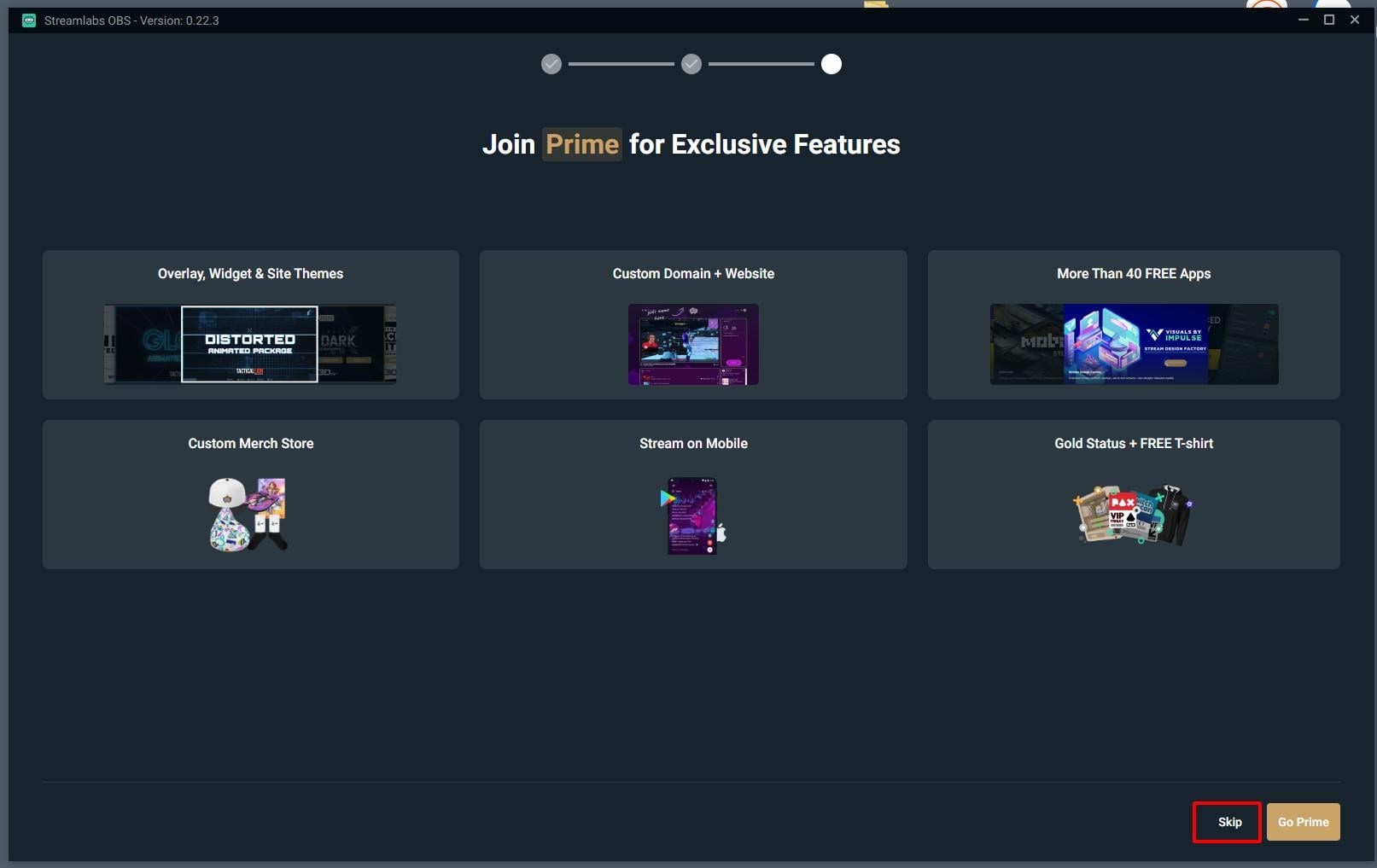 Bạn các mục giống mình nhé! Do mình không sử dụng Prime (mục trả phí cho streamlabs) nên bạn sẽ skip luôn nhé!
