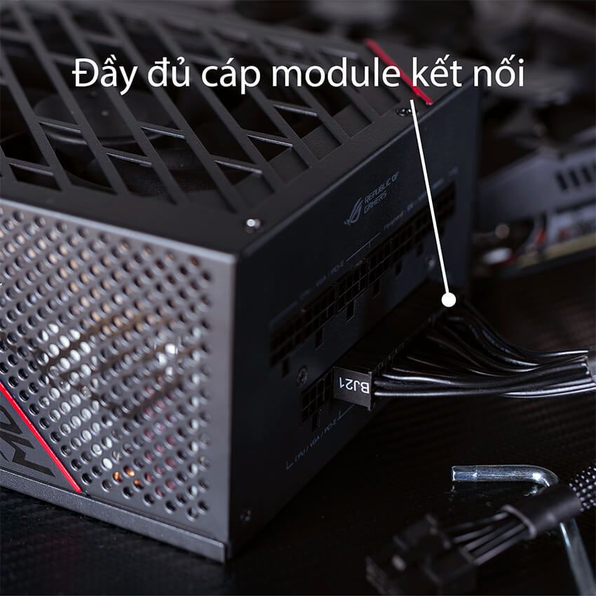 | Tính năng nổi bật | Quạt Axial-tech Fan vòng bi kép mát mẻ và bền bỉ ROG Heatsink giúp làm mát và làm tăng tuổi thọ linh kiện Hiệu suất đạt chuẩn 80 PLUS GOLD Sử dụng linh kiện và tụ điện cao cấp đến từ Nhật Bản Chuẩn Full-Module giúp lắp đặt và đi dây dễ dàng |