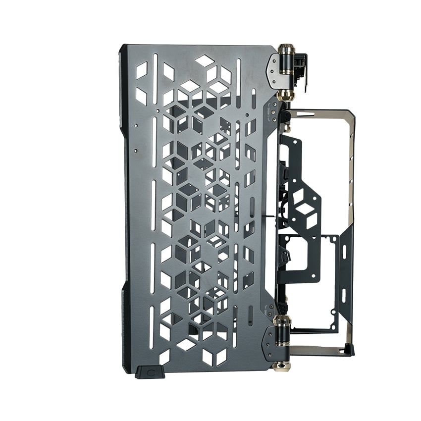 Bản lề hiệu suất cao kết nối 2 cánh và phần giữa khung máy và cho phép tái cố định vị trí mượt mà ở bất kỳ góc độ nào mà người dùng muốn. Khoá Allen cũng được đính kèm để điều chỉnh áp lực lên bản lề giúp nó dễ di chuyển hoặc trụ được trước những linh kiện nặng. Độ cơ động cao của khung máy này là yếu tố quan trọng cho người dùng tạo nên những bộ máy với tản nhiệt nước đỉnh cao và độc đáo.
