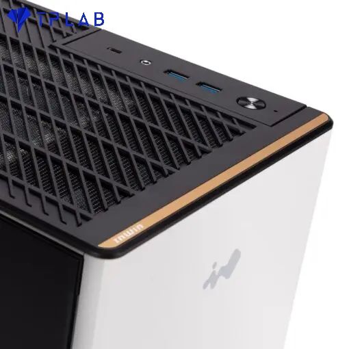 The tinted tempered glass side panel complements the A5’s overall modern vibe. The front panel is pristinely clean and is embellished with a silver InWin logo and a brushed golden aluminium sheet.