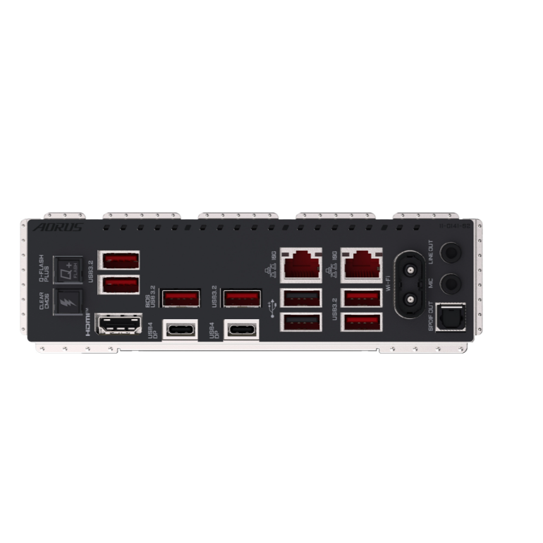 Back Panel I/O Ports | 1 x Q-Flash Plus button 1 x Clear CMOS button 1 x HDMI port (Note) 2 x USB4® USB Type-C® ports (DisplayPorts (Note)) 6 x USB 3.2 Gen 2 Type-A ports (red) 2 x USB 2.0/1.1 ports 2 x RJ-45 ports 2 x antenna connectors (2T2R) 1 x optical S/PDIF Out connector 2 x audio jacks